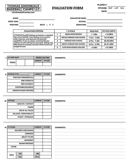 There will college recruiters from all levels of college baseball in attendance and help you find a place to play! (There is no official evaluation form given at this style camp).